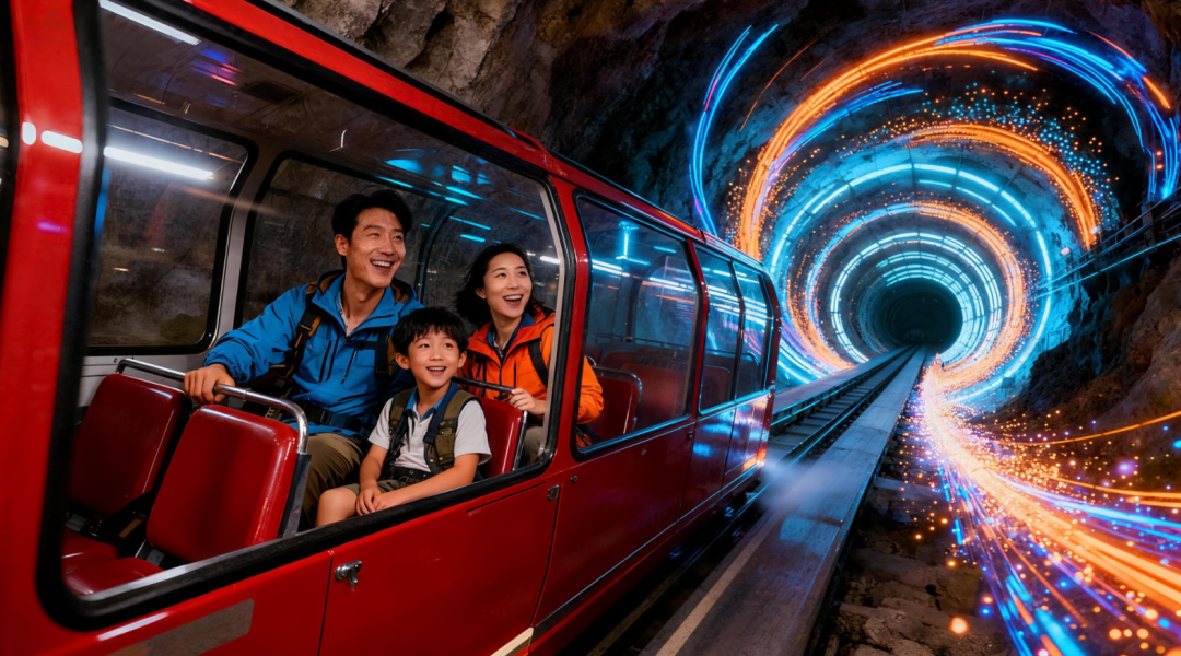 在地心715英尺米处的能量广场,一场震撼光影秀在此上演。幽暗巷道被光影与萤石点亮,流光穿梭岩壁,声浪回荡地心。